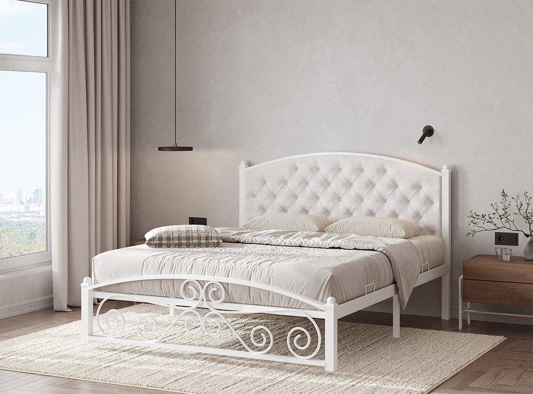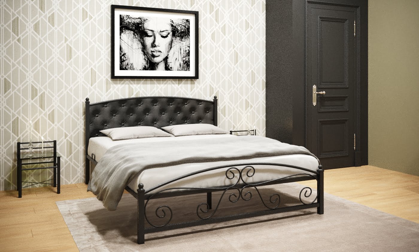 Кованая металлическая кровать Диана с мягким изголовьем — прекрасный выбор для комфортного сна. Особую неповторимость облику кровати придает каретная стяжка изголовья и декоративные элементы изножья. Материал изголовья: экокожа либо велюр Ares. К ней отлично подойдет матрас ЭОС Тип 5а.
