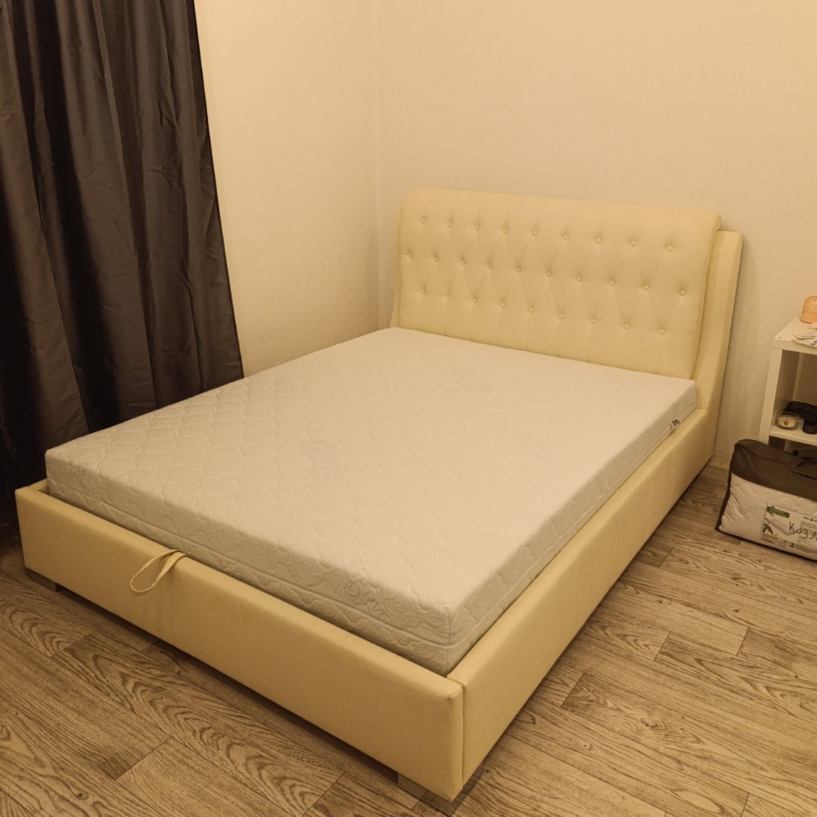 С переездом решили, что нам с мужем нужна нормальная большая кровать, ну и чтоб вписывалась интерьер. По магазинам ходить было некогда, поэтому искали онлайн. Изготавливали долговато, но привезли в срок, предупредили заранее. Все было упаковано аккуратно, никаких сколов или дырок в пленке. Ну и сам процесс покупки онлайн гораздо проще, не первый раз так делаем. Ширину взяли сразу на 180, чтобы комфортно было, благо размеры комнаты позволяют. Изголовье с декором вроде, но в глаза не бросается, смотрится шикарно. И потом еще оценили механизм подъемный, можно убрать внутрь белье или пледы, сэкономить место. Поднимается система легко, не нужно напрягаться особо, при этом держится крепко и не падает обратно. А муж сказал, что сделано на совесть, похвалил и качество дерева, и саму сборку.