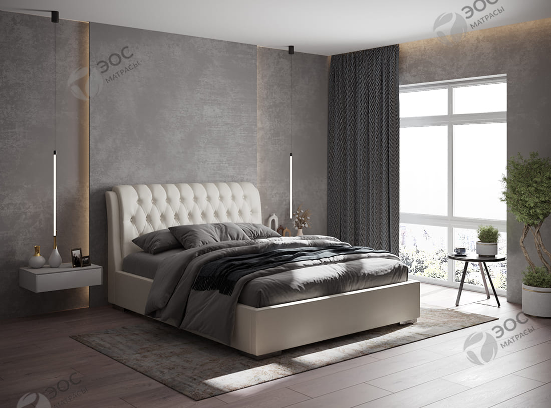 Изюминка кровати «Royal» — мягкое закругленное изголовье с каретной стяжкой. Она создает ощущение роскоши и эксклюзивности. Закругленное мягкое изголовье позволяет комфортно облокотиться на спинку. Декорация пуговками создает дополнительные акценты. Кровать производится со встроенным основанием с ортопедическими ламелями. К ней отлично подойдет матрас ЭОС Тип 13