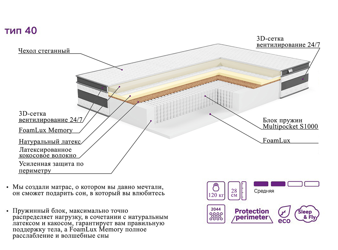 | Материалы | FoamLux (пенополиуретан), FoamLux Memory (пена с памятью формы), Латексированное кокосовое волокно, Натуральный латекс, Твердый войлок |