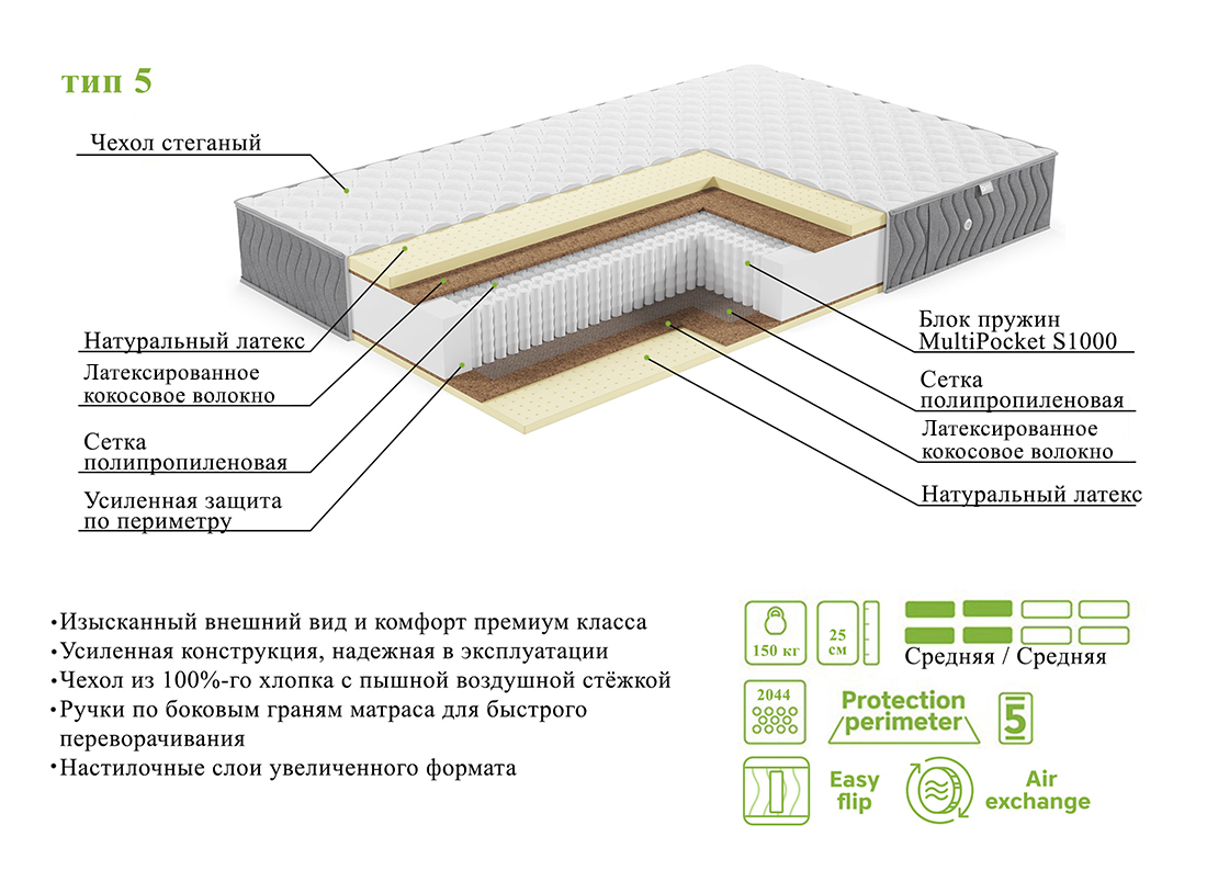 • Вывели анатомические свойства на максимум!  Пружинный блок премиум-класса MultiPocket S1000 сочетается с настилочными слоями из латекса и кокосовой койры, что обеспечивает полноценную поддержку всего тела. А стежка и наполнение чехла — это как сотни подушек, которые придают ощущение легкости.