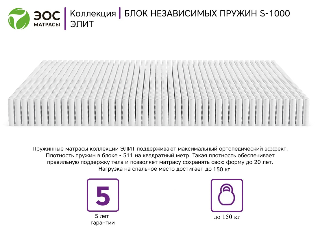 Блок позволяет достичь максимально возможной гибкости и точечной эластичности. Матрасы на основе S1000 выдерживают большое давление и обладают наивысшим ортопедическим эффектом. Плотность размещения пружин – 511 пружин/м2